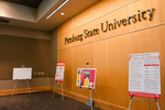 Four of the posters on display under the Pittsburg State University sign on the wood paneled wall.