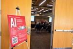 AI Symposium sign outside the door of the event, the second panel speakers are on the stage.