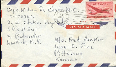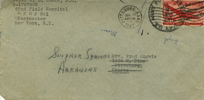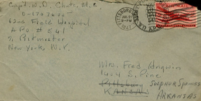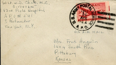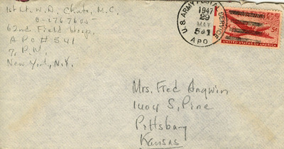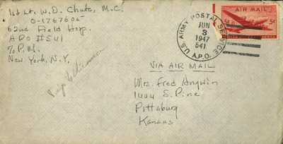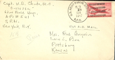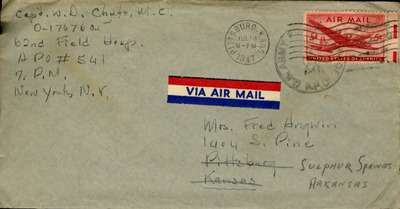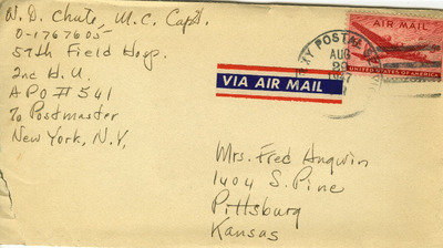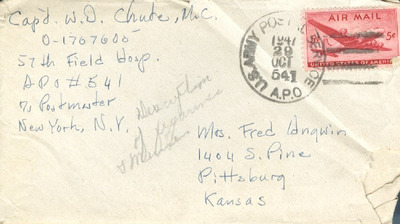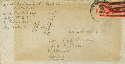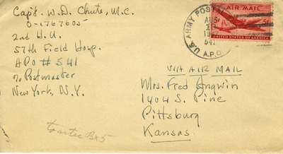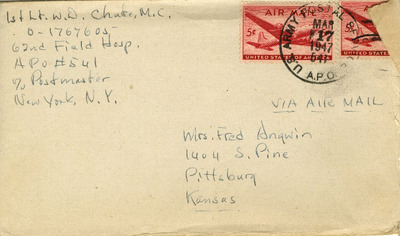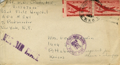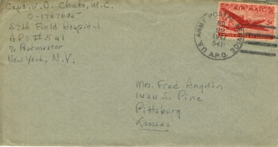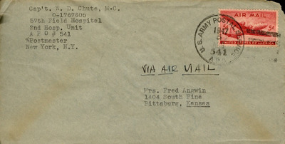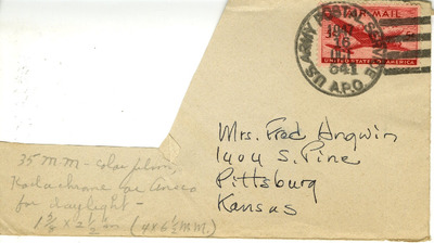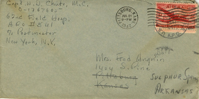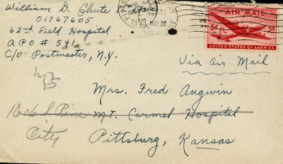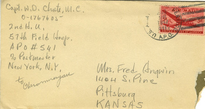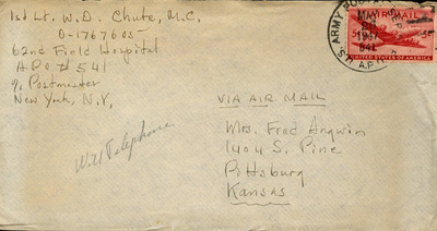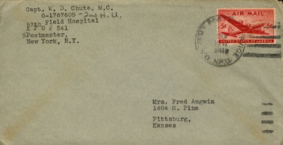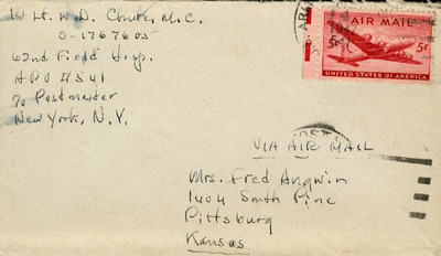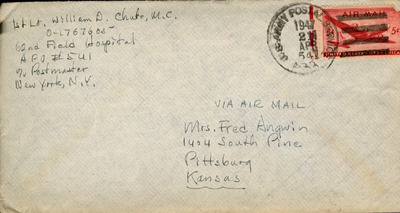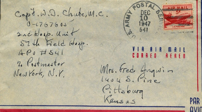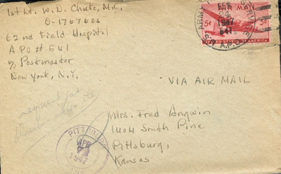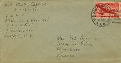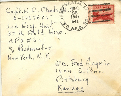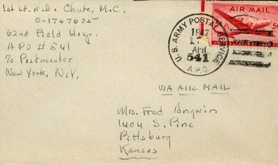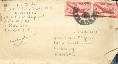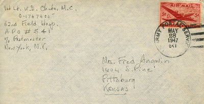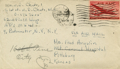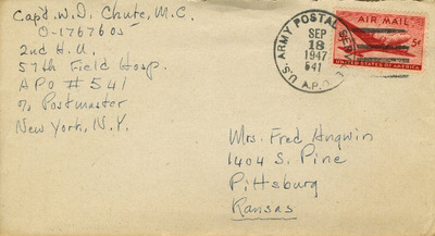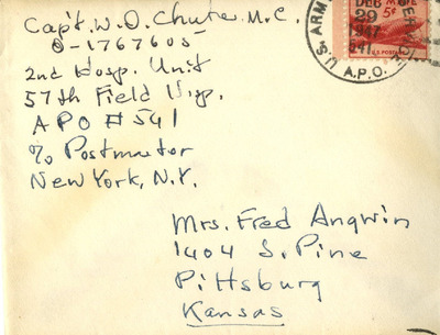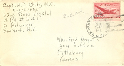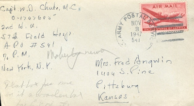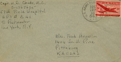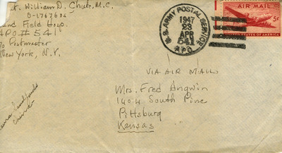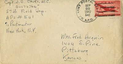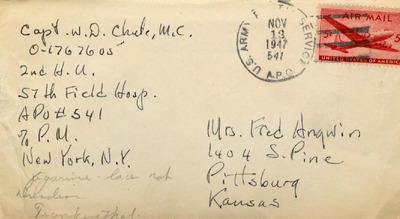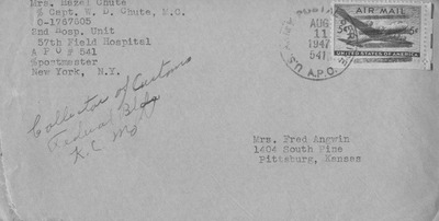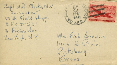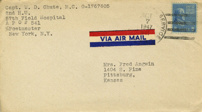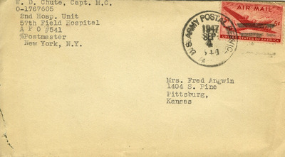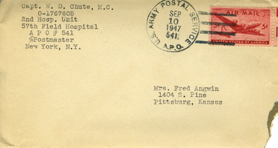 Deward and Hazel Angwin Chute, who both attended the Kansas State Teachers College in Pittsburg, exchanged dozens of letters between 1946 and 1948 while Deward served in the U.S. military during World War II. Hazel also corresponded with her mother, Lucy May Angwin, and frequently described Deward's experiences overseas and traveling with him in Germany and Austria during this time period.