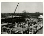 Black and white photo of Hughes Hall during its construction. The foundation is laid and the load bearing pillars are being made. Photograph was featured in the Alumnian.