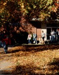 Color photo of students exiting Hughes Hall. It appears to be fall based on the leaves on the ground.