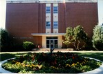 Color photo of Hughes Hall looking straight at the center of the building with the round planter in the foreground.