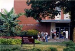 Color photo of students hanging out on the steps of Hughes Hall. The sign for the building reads "College of Education: Curriculum and Instruction; Psychology and Counseling; Special Services and Leadership Studies"
