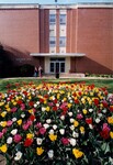 Color photo of the planter in front of Hughes Hall. It is full of yellow, white, pink, and red tulips. Students talk by the steps to the building.