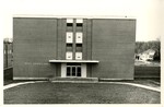 Black and white photo of the front of Rees Hughes Hall, taken higher up off the ground. Construction seems to have just finished with the ground surrounding the building being just dirt, no grass or plants.