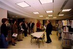 Color photo of the Presiden't Council receiving a tour of the renovated basement which holds teacher education materials.