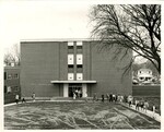 Black and white photo of Rees Hughes Hall, students exit the front doors and walk along the sidewalks. The ground in front of the building is simply dirt, no grass or plants, suggesting the building was newly constructed in the photo.