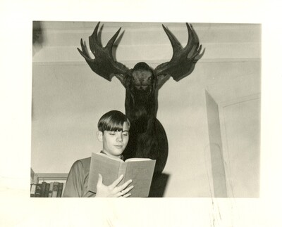 Black and white photo of Douglas Haltom, Kansas State College of Pittsburg freshman from Anthony, Ks., studies intently under a moosehead on the third floor of KSC's Porter Library.