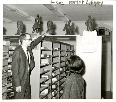 Black and white photo of two people in Porter Library, the man appears to be showing the woman the small statues and busts on top of the shelves.