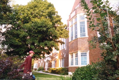 Color photo of the front of Porter Hall. A student is walking along the sidewalk.