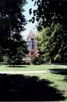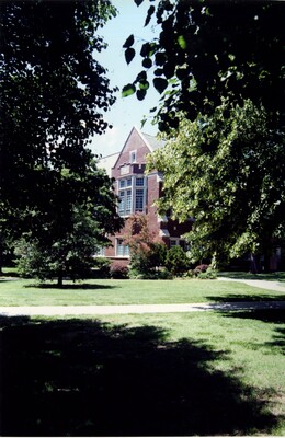 Color photo of the eastern wing of Porter Hall, seen through the trees.