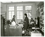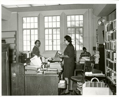 Black and white photo of two librarians and a student in Porter Library. Books are stacked on the desks. Notably, one of the librarians seems to have a cigarette.