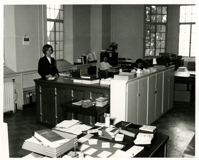 Black and white photo of three librarians at a service desk