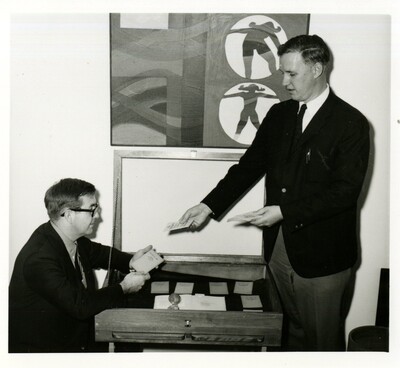 Black and white photo of Gene DeGruson (left) and Norman Tanis (right) looking at Little Blue Books taken from a wood display case.