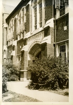 Black and white photo of Porter Library taken from an angle, showing the windows and roof.