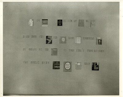 Black and white photo of a display in Porter Library. A mix of letters and book covers are used to create sentences. "'Listen' TO 'The Other Side of the Record.' 'This Modern Music' IS LED BY 'The Eloquent Baton' OF 'Myaskovsky' HEAR HOW THE 'Shining Trumpets', THE 'Violin Playing', AND 'The Clarinet and Clarinet Playing' COMBINE 'Music and Imagination' TO BRING US THE 'Pleasures of Music.' IF YOU CAN'T UNDERSTAND THE MUSIC READ 'The Book of Musical Knowledge', 'Historical Anthology of Music', 'The Instruments of Music', AND 'The Complete Book of 20th Century Music'."