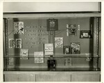 Black and white photo of a display in Porter Library. "Laughter is the best medicine for a disease contagious after tests known as "Oh well, it's just 3/4 of my grade." Some of the books on display are: