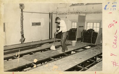 Black and white photo of a man working in Porter during renovations. He is sweeping a partial floor.