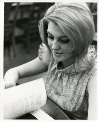 Black and white photo of a woman looking through a book, c. 1960s