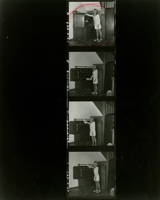 Black and white slides of a woman posing for the camera - she is dusting the writing desk (now in Special Collections).
