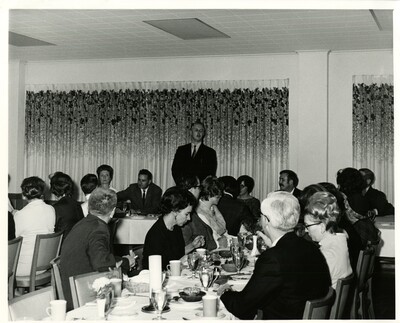 Black and white photo of Norman Tanis standing and talking to banquet attendees, sitting and eating at tables. Second to his left sits Gene DeGruson.