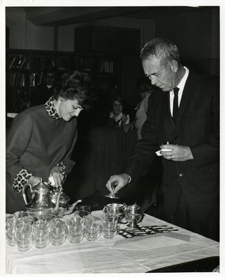 Black and white photo of two banquet guests pouring drinks from a tea pot.