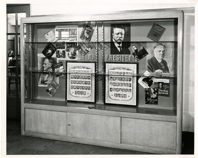 Black and white photo of a display in Porter Library. "Our Mr. Presidents," with photos and books on the presidents of the United States.