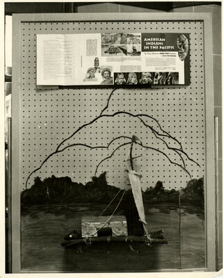 Black and white photo of a display in Porter Library. It displays pages of American Indians in the Pacific and a diagram of a traditional native american home.