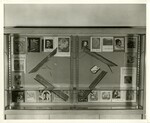 Black and white photo of a display in Porter Library; covers of books on painting and painters are pinned on the edges of the board and a broken frame with art supplies is in the middle.