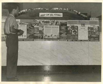 Black and white photo of a display in Porter Library on the United Nations. Posters of the countries comprising the UN line the wall and a banner of countries flags reads "Keep 'em All Flying"