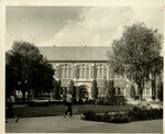 Black and white photo of Porter Hall as seen from the Oval, people walk along the sidewalks.