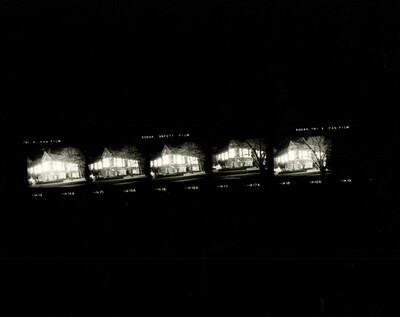 Scanned negatives of the exterior of Porter Library at night, the lights inside the second floor illuminate the windows.