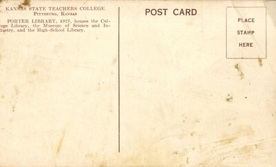 Back of postcard of Porter Library [id Porter 4-006] which reads "Porter Library, 1927, houses the College Library, the Museum of Science and Industry, and the High-School Library."
