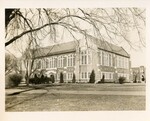 Black and white photo of the front of Porter Library as seen from the Oval.