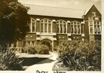 Black and white photo of the front of Porter Library, the second floor windows are open.