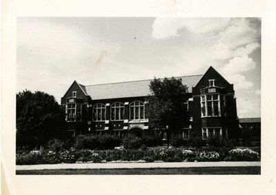 Black and white photo of Porter Library as seen from the Oval. Flowers and plant life line the sidewalks.