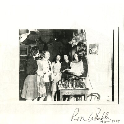 Black and white photo of a man, maybe a professor, talking to a group of women in a room of taxidermied animals, possibly the Museum of Science inside Porter Library, c. 1950s. Signed by Ron Womble, 19 June 1987, potentially the donor of the photo.