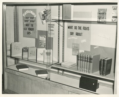 Black and white photo of a display case. Two signs in the case read "Folklorists; Collect, Record, Compare, Interpret; What the Folk Memory Says" and "What do the Folks Say About numskulls, life, gods, animals." Related books are in the case.