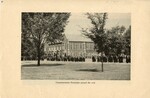 Black and white photo of a commencement procession through the Oval, graduates in cap and gowns walk the sidewalks past Porter Library.
