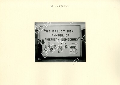 Black and white photo of a librarian looking the large board "The Ballot Box Sympbol of American Democracy." Drawings of various people with ballots are lined up to drop them in the ballot box reading "VOTE; All here united to maintain government of, by, and for the people"
