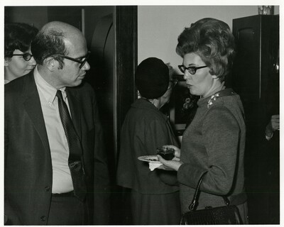 Black and white photo of John Ganalda and Mrs. Kathy Carr at the opening of the Haldeman-Julius Reading Room.