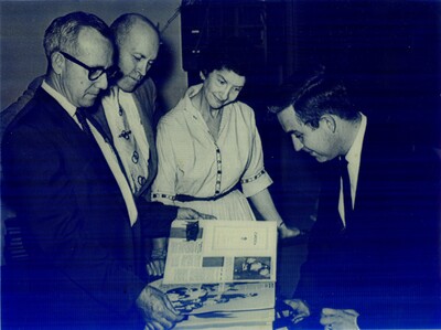 Bluescale photo of four people reading a book.