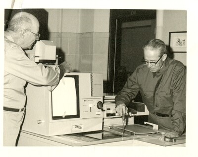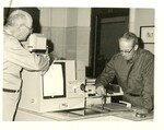 Black and white photo of Gibb Clark and Clarence Rogers, library personell, working on a machine, possibly a scanner.