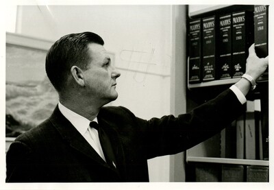 Black and white photo of Pittsburg businessman Melvin Kennett making use of information resources at Porter Library on the campus of Kansas State College of Pittsburg. KSC director of libraries Norman Tanis points out that the library provides many tax services for those who do their own income tax returns.