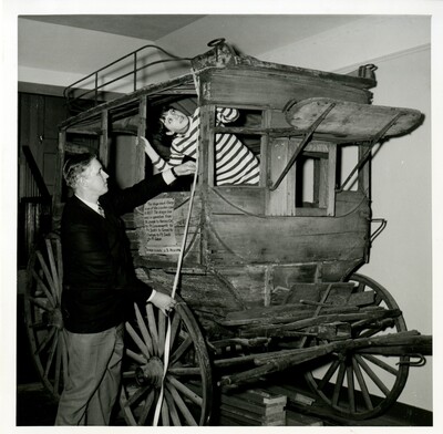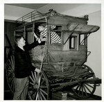 Black and white photo of Norman Tanis and student Julie Vineyard. Vineyard sits inside a stage coach while Tanis holds a ribbon that is tied to the top of it. Sign on the coach reads, "This stage coach (Daisy) is one of the coaches used in 1857. The stage line was in operation from St. Joseph to Kansas Cit. to Ft. Leavenworth to Ft. Scott to Girard to Chetopa to Ft. Smith to Ft. Gibson. Stage coach J.T. Moore"
