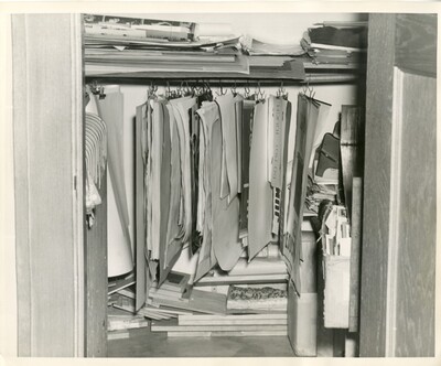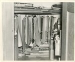 Black and white photo of the inside of a cabinit. Signs hang from a pole. One reads "DO NOT TOUCH." Presumably these are used through out the library to notify patrons of things.