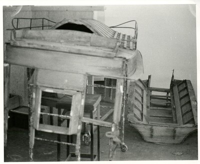 Black and white photo of wooden items, possibly related to the stage coach, Daisy.