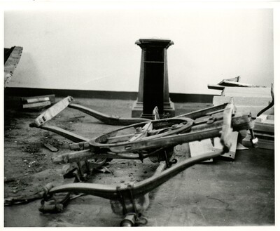 Black and white photo of wooden and metal items, possibly related to the stage coach, Daisy.