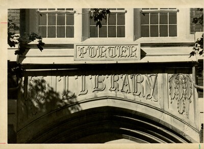 Black and white photo of the detail of the Porter Library stone relief sign above the doors.