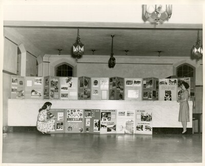 Black and white photo of two women setting up poster board displays about Young Britain, at home, at school, on the farm, and at war, c. 1940s or 50s